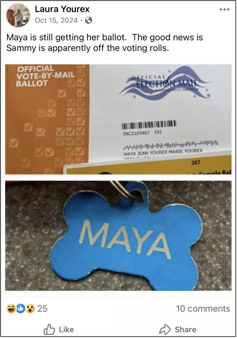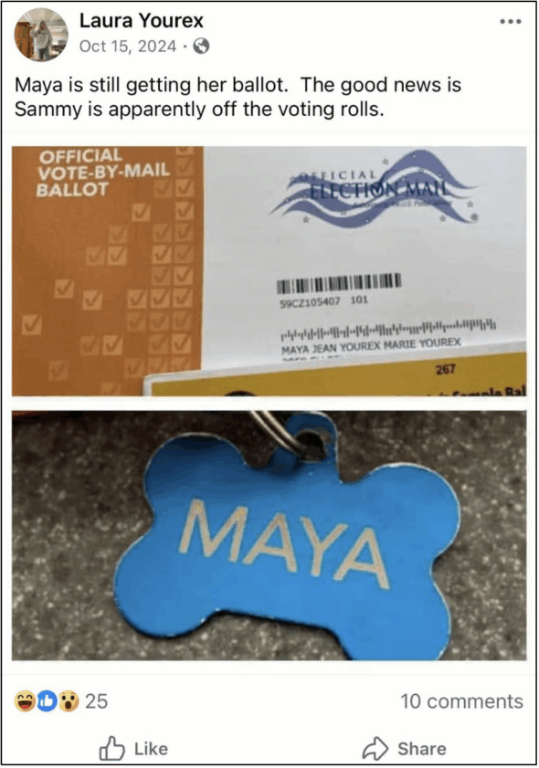 Yourex allegedly bragged about the feat on social media, sharing a picture of Maya toting an “I Voted” sticker and posing with the illegal ballot in January 2022, prosecutors said. In October, Yourex posted a photo of Maya’s dog tag and a vote-by-mail ballot with the caption, “Maya is still getting her ballot,” even though the dog had passed away.