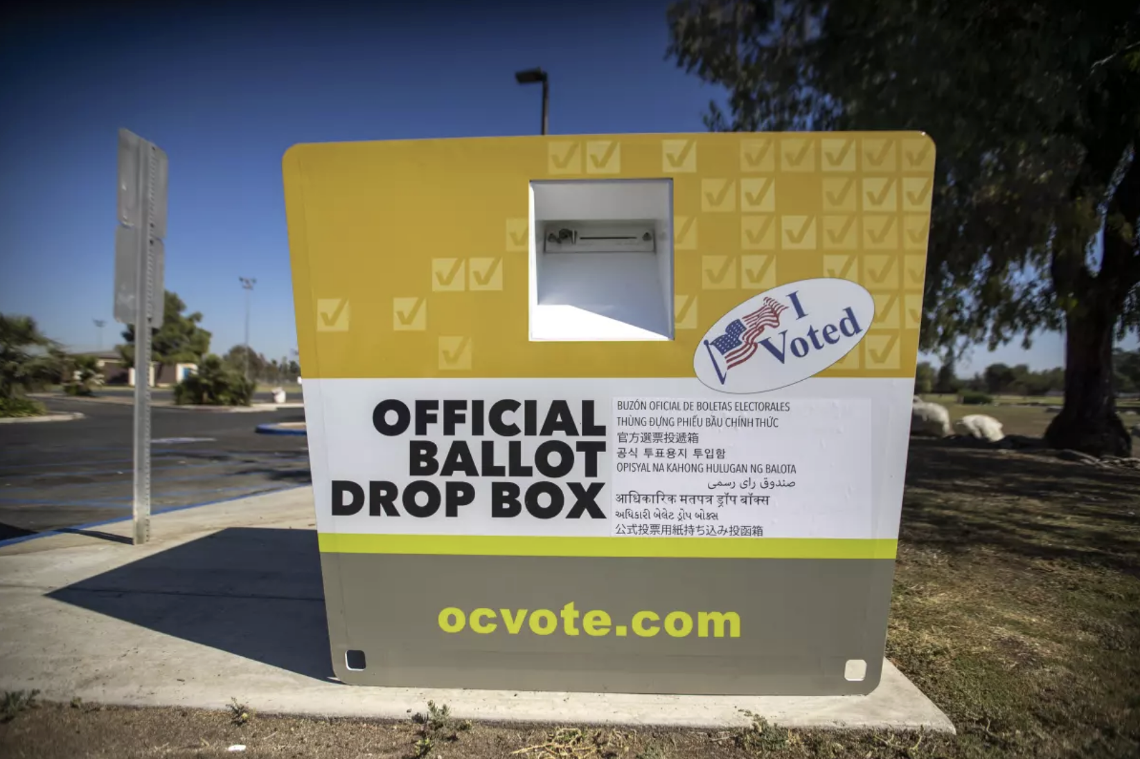 A view of an official Orange County Registrar of Voters ballot drop box at Carl Thornton Park in Santa Ana on Oct. 13, 2020. (Allen J. Schaben / Los Angeles Times)