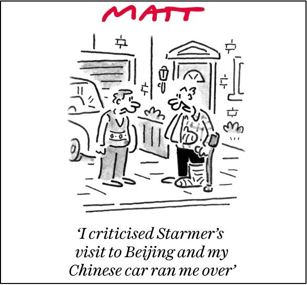 This cartoon refers to PM Starmer’s recent visit to China (the first by a British PM in 8 years) to meet President Xi Jinping – with the intent of improving UK-China relations (trade, technology, etc.).